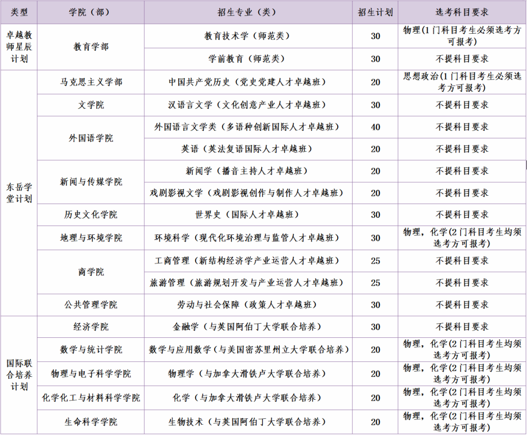 (一)新闻学、旅游管理专业入围考生高考总成绩须达到山东省2024年夏季高考普通类一段线。金融学、数学与应用数学、物理学、化学、生物技术专业入围考生高考总成绩须达到山东省2024年夏季高考特殊类型招生控制线下20分。其余专业入围考生高考总成绩须达到山东省2024年夏季高考特殊类型招生控制线。