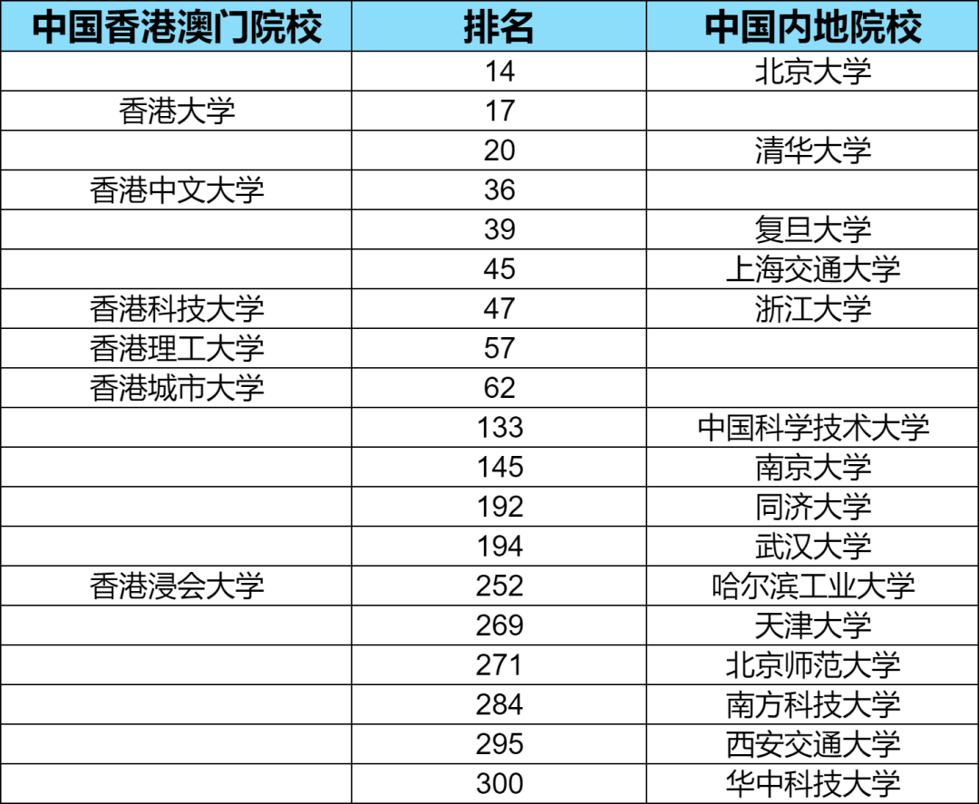从2025年QS世界大学排名中可以看出,香港大学的排名位于清华和北大之间,也就说明香港大学的实力与内地清华北大实力不相上下;香港中文大学排名优于复旦大学3名;而香港科技大学与浙江大学排名一致,比上海交通大学低2个名次;香港城市大学排名62,远超中国科学技术大学、南京大学、同济大学和武汉大学;香港浸会大学与哈尔滨工业大学排名一致,比天津大学、北京师范大学、南方科技大学和西安交通大学靠前很多。