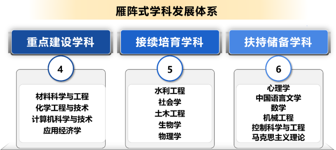 学校实施优势学科强化战略,推进学科专业交叉融合发展。积极融入新发展格局,主动适应国家重大战略和区域经济社会发展需求,深化学科专业供给侧改革,构筑了“456”雁阵式学科发展体系,为高质量人才培养体系建设夯基垒台。